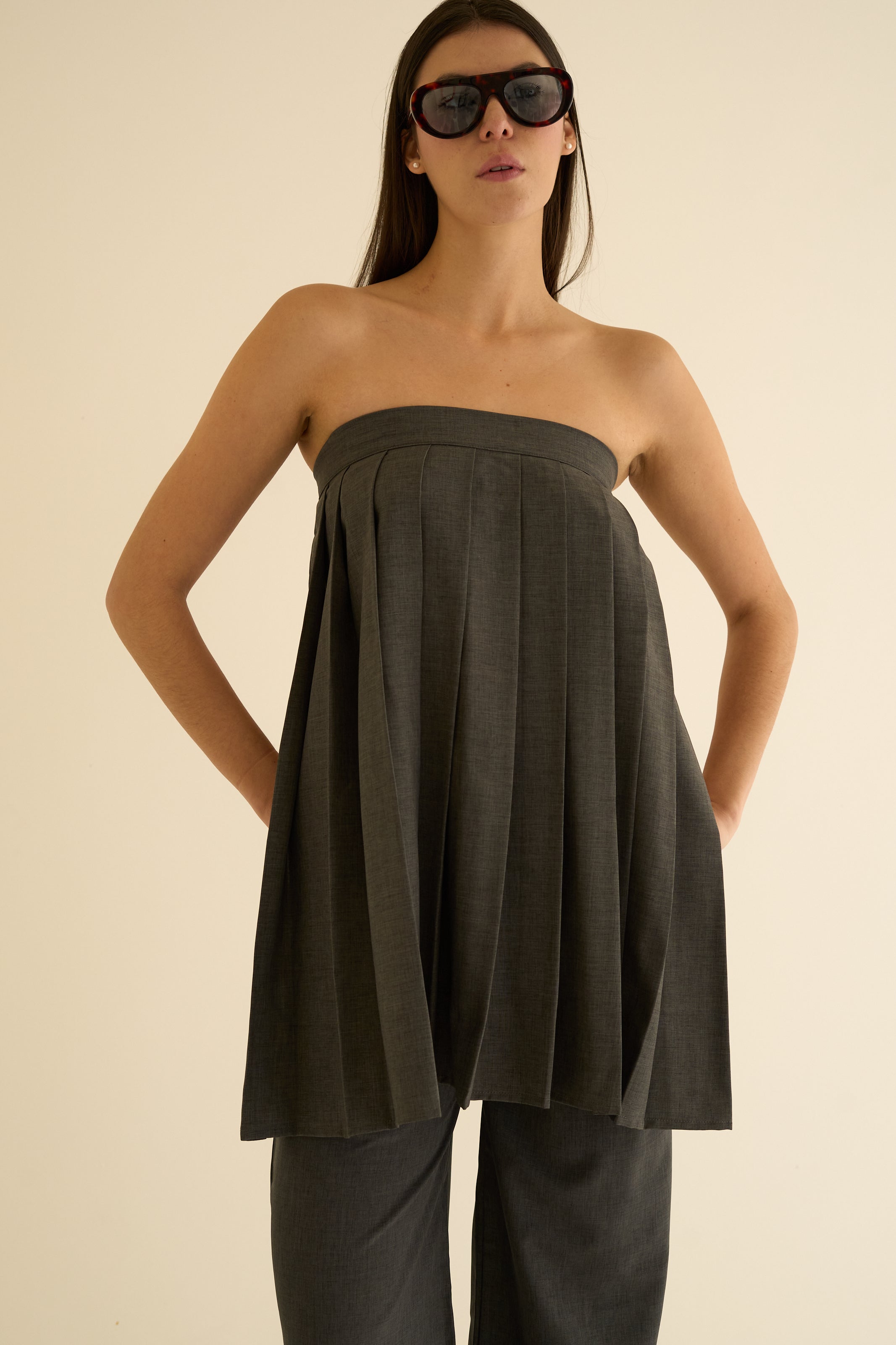 La pieza superior es una falda plisada sobrepuesta, pensada para transformar el look: puedes llevarla como falda o adaptarla como top, creando distintas lecturas de un mismo set.